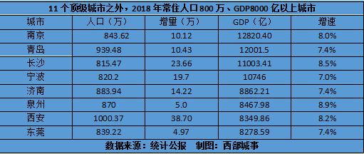 如果按照人口和GDP同时达到800万和8000亿以上的标准,上述11个城市之外,南京、青岛、长沙、宁波、济南、泉州、西安、东莞共8个城市,是目前最接近达标的“双料城市”。