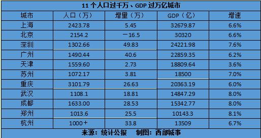 综合这比两份名单,当前GDP过万亿、人口过千万的“双料”城市,实际上只有上海、北京、广州、深圳、天津、苏州、重庆、武汉、成都、郑州、杭州,共11个。