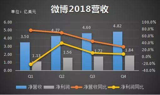一个很明显的趋势是:2017年微博营收的各季度增长在不断提速越跑越快,而其2018年的增长则在逐季度降温萎缩。2017Q1其净营收同比增长为0.799亿美元,Q4同比增长已经拉大到1.647亿美元。同样的数据在2018年Q1为1.507亿美元,到了Q4反而缩至1.045亿。