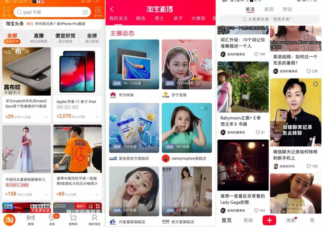 (▲左一、二为淘宝优先呈现用户关注商家,也是平台给商家的私域流量扶持;右一是小红书关注栏便于提升UP主的粉丝点击率)