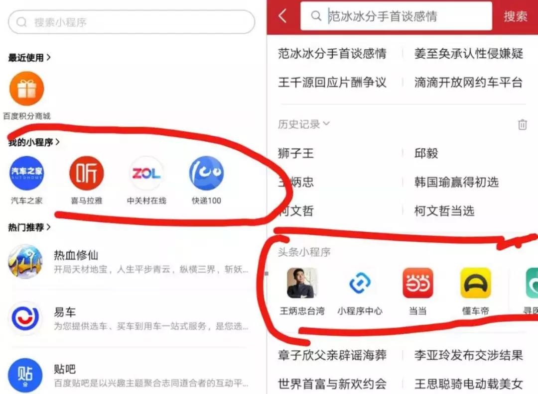 (▲左图百度App小程序,右图是头条小程序,可以理解为这些小程序运营者的私域流量扶持)