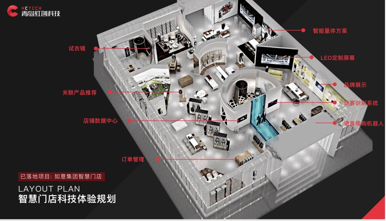 智量AI量体技术服务于服装定制品牌,线上线下数据融会贯通,通过定制展示、AI量体、3D试衣、订单管理的完整产品体系,提升品牌形象,增加复购率。红创与如意集团及京东集团合作,为如意集团打造新零售体系,打造与其定位相符的、科技感与时尚感融合的全新体验。目前第一个线下新零售定制店已经落地,并计划未来在全国布局。