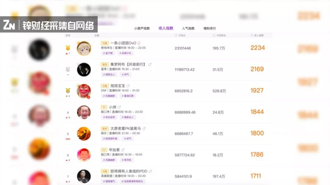 最新头部网红主播收入指数 图片来源:小葫芦数据