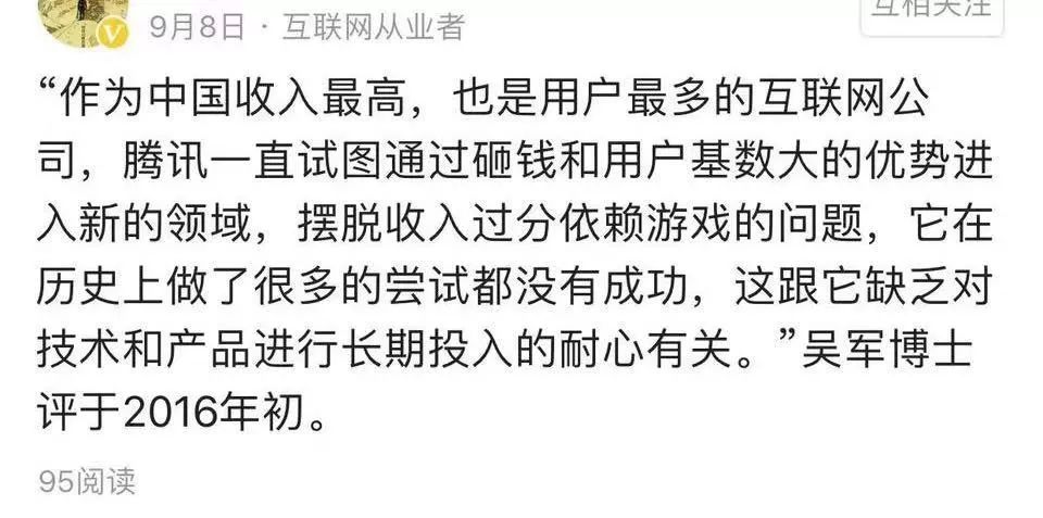 其实这些年来吴军常有对媒体发表对前东家的批评言论,比如16年初说腾讯过分依赖游戏,缺乏对技术和产品的长期投入: