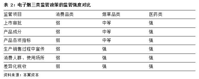 电子烟作为一种新兴的传统烟草替代品,监管政策的变化是其发展过程中的一个重要变量。目前电子烟监管政策大致有三种思路:一是将电子烟作为消费品监管,二是作为烟草类监管,三是作为药品类监管,三种监管力度依次递增。