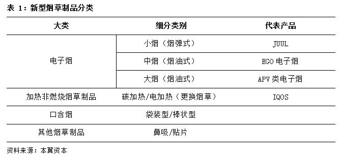 电子烟是新型烟草制品的一种,而新型烟草制品主要分为四个大类:以JUUL为代表的电子烟,以IQOS为代表的加热非燃烧烟草制品,口含烟和其他烟草制品(鼻吸、贴片等)。电子烟可分为小烟、中烟和大烟,小烟为烟弹式的仿真烟,采用气动开关不需要按钮操作;中烟为雪茄大小,使用ego烟杆;大烟的特征是使用18650型号的锂电池,直径约18mm,长度约650mm,大烟的雾化器和烟杆特性明显。加热非燃烧烟草制品以IQOS为主,是菲利普莫里斯国际研发的烟草加热系统,由于使用真正的烟草而不是烟油,IQOS的口感非常接近真烟,适用于各国烟草的强监管政策。