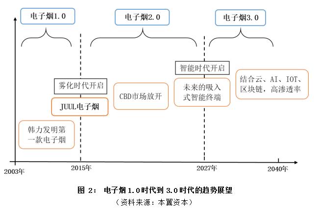 在成熟电子烟2.0时代,我们将会见到各式各样的雾化设备、药剂和快消品走进生活,电子烟将在2.0时代达到产品升级路线上的成熟;而电子烟3.0时代将会实现产品功能上的彻底颠覆,正如智能手机之于功能手机,电子烟将成为拥有丰富功能和生态应用的智能载体,比如通过雾化过程检测人体健康并反馈数据至云端,经过人工智能分析后输出健康指数等,3.0版的电子烟或许将成为人的另一种“健康手机”,成为高渗透率、高度集成度的科技消费品。