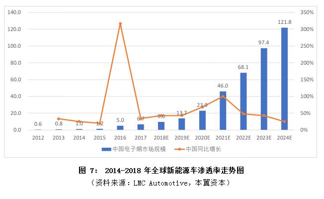 2)两者市场规模与渗透率均保持高速增长。2017年全球电子烟市场规模达到 120 亿美元,平均复合增速43%,全球消费者人数达到 3500 万,2013-2017 年全球电子烟的渗透率从0.37%升至 2.14%。全球新能源车 2018 年销量185万辆,平均复合增速 66%,2014-2018 年全球新能源车的渗透率从0.03%升至2%。
