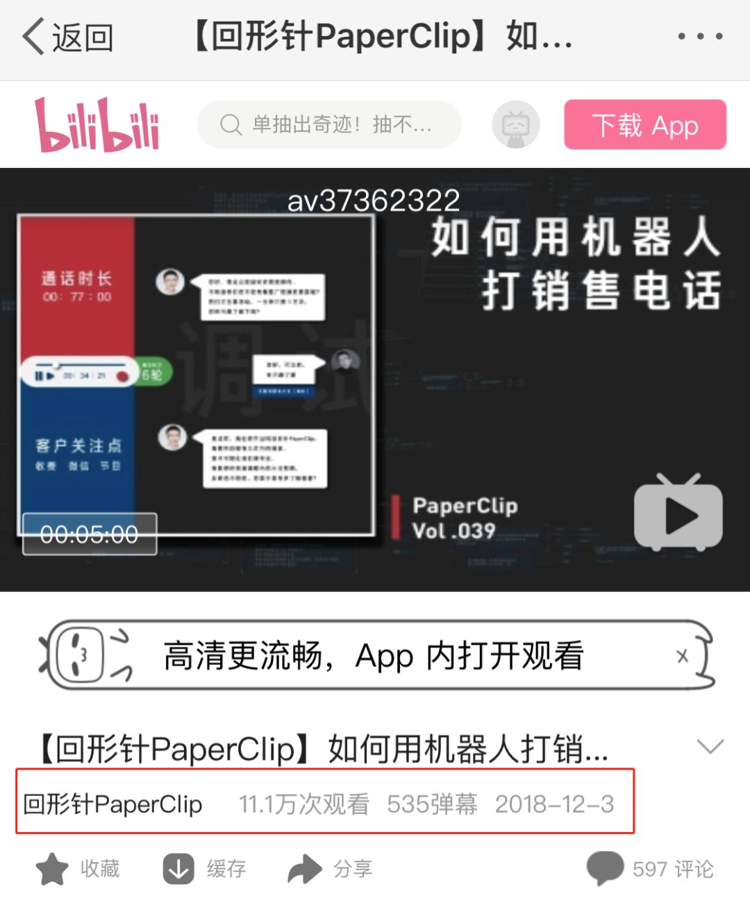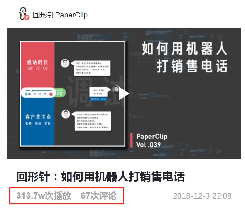 具体而言,我们和知名的科技视频自媒体回形针PaperClip进行了一期合作,用通俗、诙谐的语言和案例,以及可视化的逻辑拆解,充分展示了电话机器人这种新兴事物的原理和外在表现,结果引起了非常大的轰动。我们的这个视频在全网的观看量超过350万,分别是B站11万,公众号3万,美拍313万: