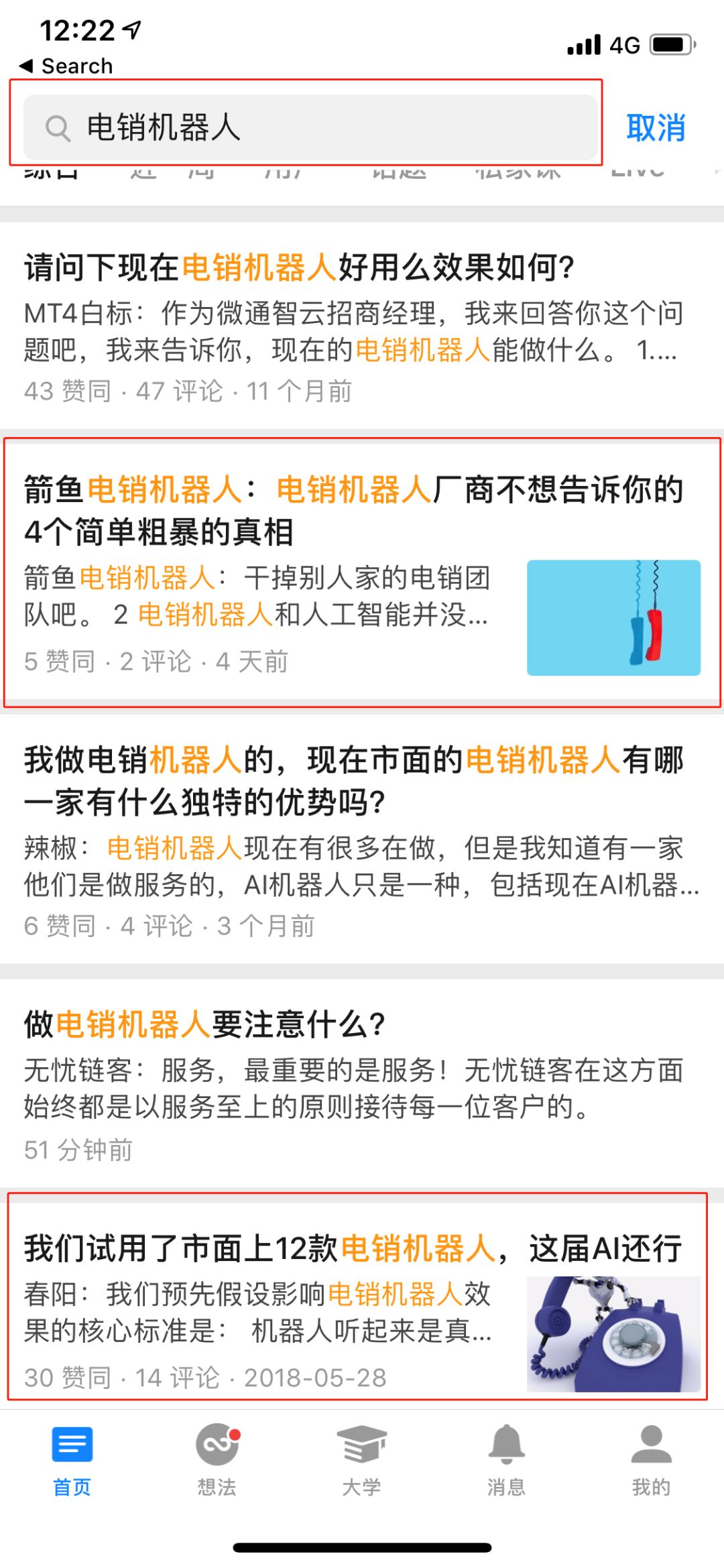 所以要达到这些主流渠道的最大限度的内容能见度,毫无疑问我们需要将尽可能相关的、多的内容,散发到上述平台。实际上上面5个平台,每个渠道都有自己的生态玩法,都能单独拎出来写一篇。以知乎为例,在我之前负责的电销机器人的项目中,如果你去搜索电话机器人,在首页中至少有2~3条是属于我们的,无论是问答、专栏还是账号本身,我们都处在前列。