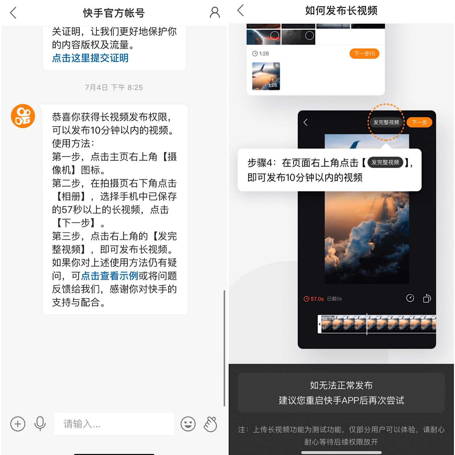 7月19日,36氪获悉,快手正在小范围内测长视频功能,时长限制在57秒以上,10分钟以内。在功能介绍页面,快手表示目前该功能为测试功能,仅部分用户可以体验,后续会权限放开。