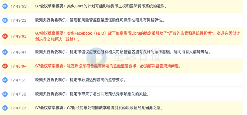 G7会议草案概要7月18日发布。概要中指出,稳定币必须符合最高标准的金融监管要求,必须解决监管鸿沟问题。类似Facebook(FB.O)旗下加密货币Libra的稳定币引发了“严峻的监管和系统性担忧”,必须在类似计划执行之前解决(担忧)。类似Libra的计划可能影响货币主权和国际货币系统的运作。此外,G7财长同意处理因数字经济引发的税收挑战是当务之急。(金十)