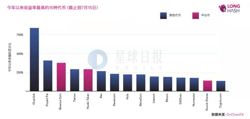 比特币在2019年已经上涨192%,而根据OnChainFX的数据,截至7月16日, Binance Coin(BNB)、Huobi Token(HT)和 Kucoin Shares(KCS)都属于2019年迄今为止收益率排名前15的币种。事实上,前两种平台币的表现甚至超过了比特币—今年的涨幅分别达到379%和292%,而KCS的涨幅也达到142%。上述所有平台币的表现明显都优于BCH、XRP和ETH等主流竞争币。分析称可能因这三种代币都为使用其平台的用户提供奖励。未来值得关注的是,这些平台币的连连走俏是否会促使更多主流交易所发行自己的代币;如果发币,投资者又会不会对其表现出同样浓厚的兴趣。(LongHash)