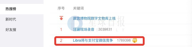 “Libra将与支付宝微信竞争”登上微博热搜榜第二名