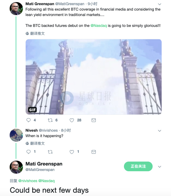 eToro高级市场分析师Mati Greenspan近日发推表示:“在金融媒体对BTC的优秀报道之后,以及考虑到传统市场的低收益环境,BTC支持的期货在纳斯达克的首次亮相将非常精彩。”被问及时间时,Mati Greenspa回复“可能是接下来的几天”。