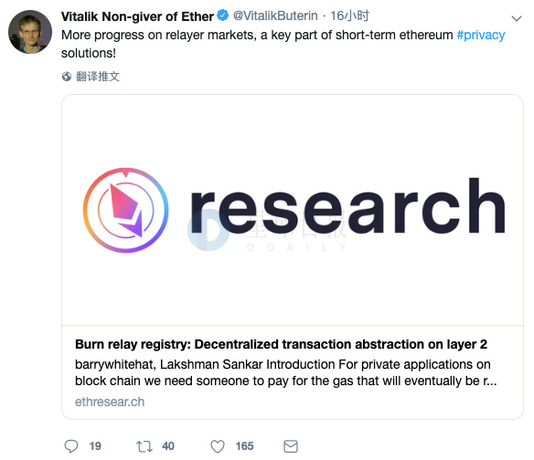 V神在推特中转发了一篇介绍中继注册销毁机制的文章。该机制目的在于抵制垃圾交易,其在以太坊第二层网络上建立一套仲裁注册机制,每一笔交易在发送广播中需要支付一定比例的费用,最后利用min_percent将其销毁。V神评论称,在中继研究取得较大进展之后,这是以太坊短期在隐私解决方案上的关键一步。