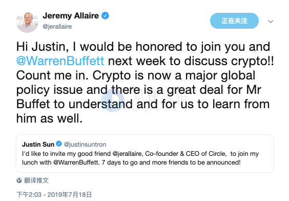 7月19日,孙宇晨邀请Circle首席执行官Jeremy Allaire与其共同参加巴菲特午餐。Allaire回应称:“很荣幸下周能与你以及巴菲特一起讨论加密货币,算上我一个。加密现在是一个重大的全球政策问题,对于巴菲特来说有很多需要了解的事情,我们也需要向他学习。”