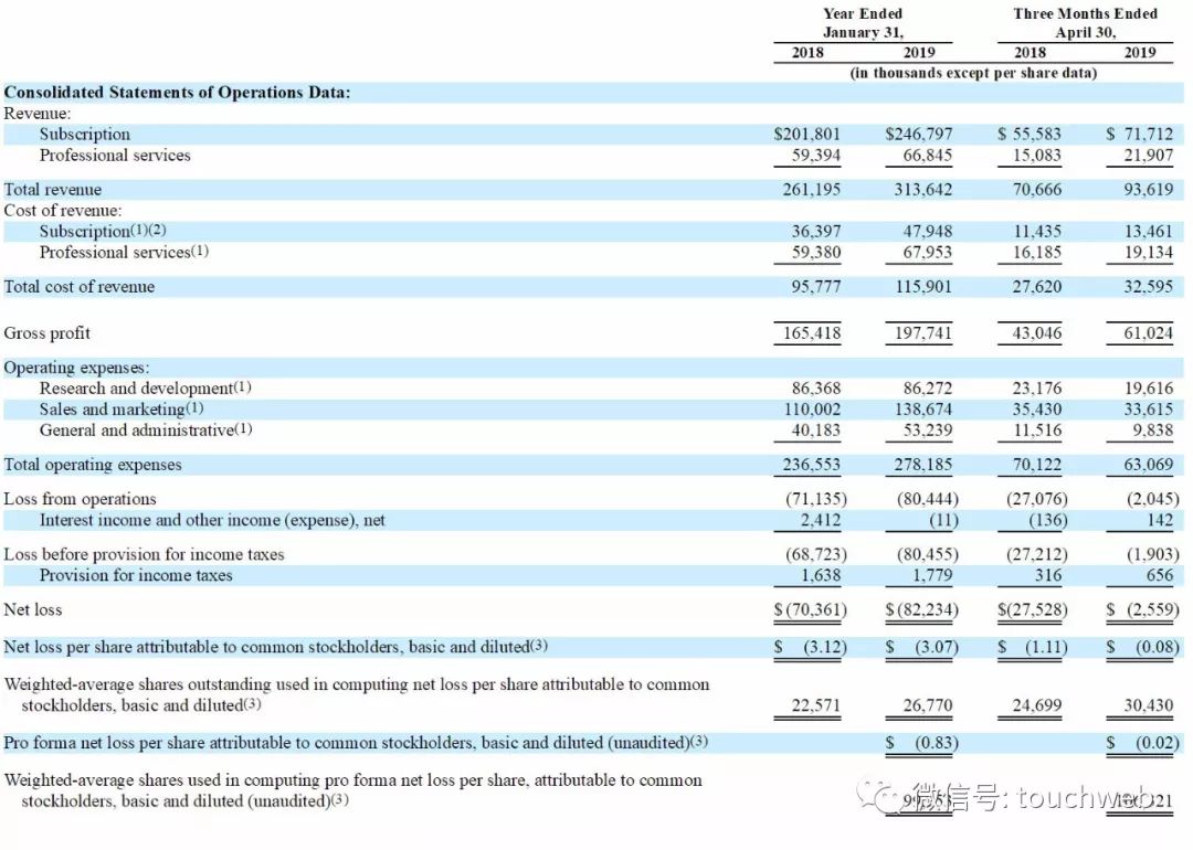 Medallia目前还处于亏损状态,其中,Medallia在截至2019年1月31日的财年亏损8223万美元,上年同期亏损为7036万美元;