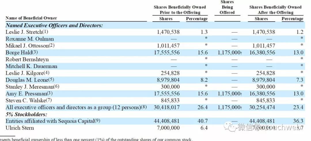 红杉帮助引入的CEO Leslie Stretch持股为1.2%,股权价值为5400万美元。