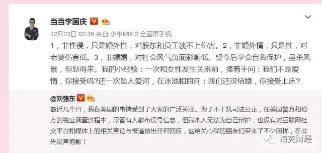 特别是在刘强东案件上,李国庆于2018年12月23日发出的有关“婚外情”、“婚外性”及个人情感经历的评点与展开,引起轩然大波,各方批判排山倒海而来。