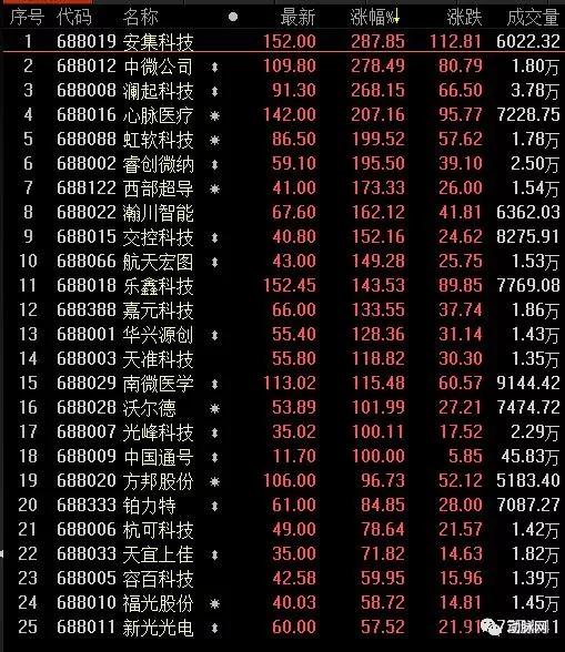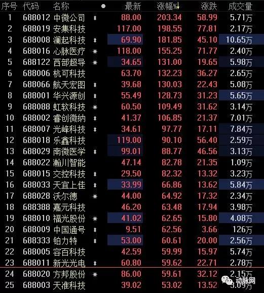 从早上9点15分开始集合竞价,25只股票的价格就已经全线大涨。9点16分,最高的澜起科技涨幅266.94%,最低的新光光电也有30.01%的涨幅。随后,到9点25分,集合竞价的结果没有大的变化,25只股票涨幅在逐步扩大。