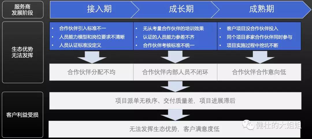 接入期如果你的引入标准不清晰,极易导致合作伙伴的类型分配不均;成长期也是催熟期,如果你不投入人力物力财力对合作伙伴进行培训考核,人员能力就无法匹配你项目交付的需求;而成熟期是合作伙伴核验培训效果的阶段,也是本企业与合作伙伴共同参与项目的重要历练。然后你发现,项目交付中拆东墙补西墙的事情频发,合作伙伴士气渐衰,合作意向一路下滑。