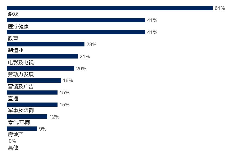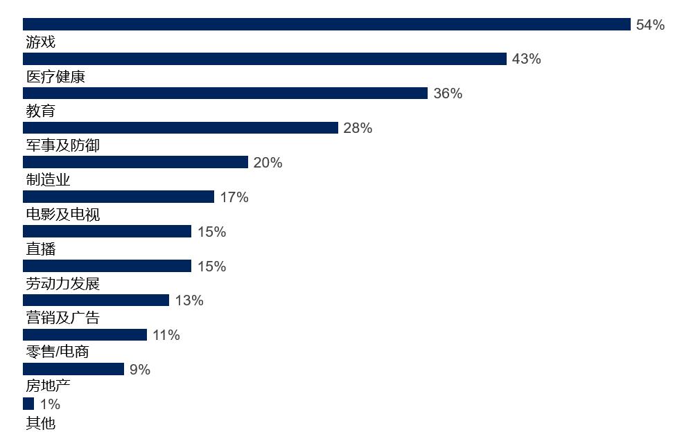 XR包括虚拟现实(VR),增强现实(AR),触觉,全息图以及使用和增强我们自然感官的各种沉浸式工具。问卷调研数据显示,XR最适用于游戏行业,其次是医疗健康与教育行业。相较于上述调研结果,另一相关调研问题“在未来12个月,你认为投资将带动哪些行业运用AR/VR/MR/XR技术或内容?”与之最大差别为军事及防御行业从第九位上升至第四位。