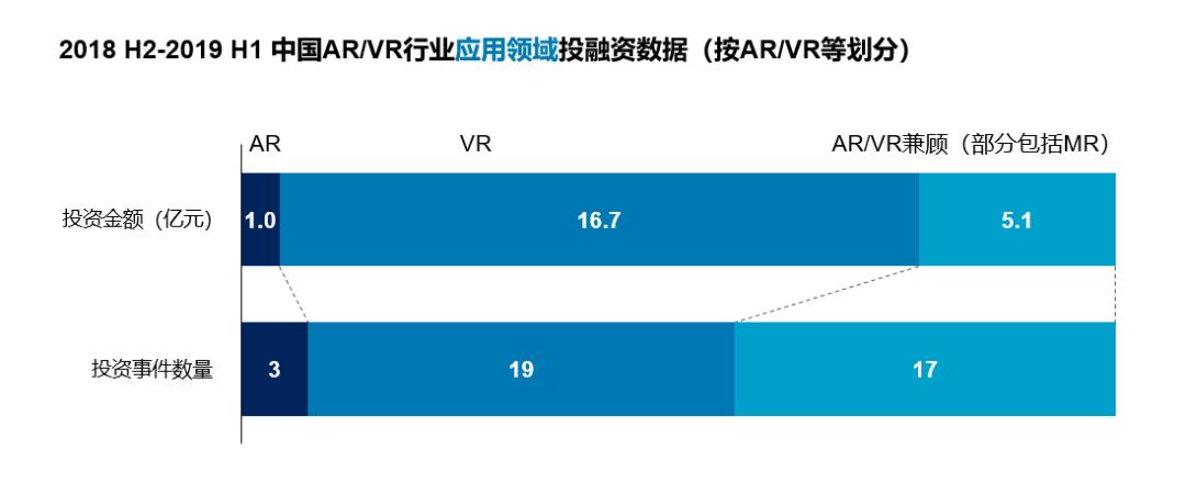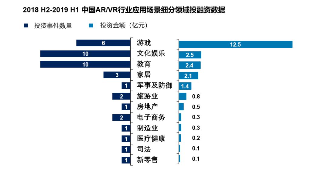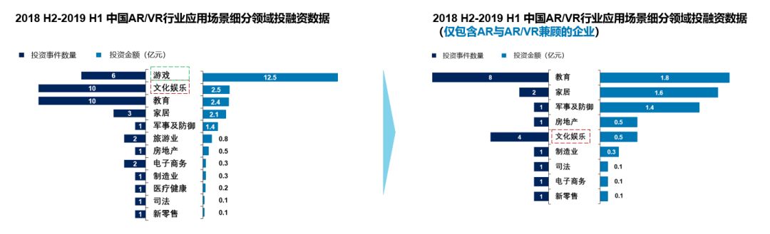 在AR与AR/VR兼顾的企业中,资本更加的集中于教育和家居领域,相比较于包含VR的应用场景细分领域投融资数据,较为显著的特征为游戏领域数据消失,文化娱乐领域数据下降。