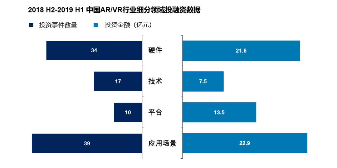 根据CVSource投中数据,本文将过往一年(2018 H2-2019 H1)的AR/VR投融资数据分为硬件、技术、平台与应用场景四大类。相信过往一年投资机构对AR/VR初创企业的投资决策能够反映对中国未来几年AR/VR行业发展的综合判断。
