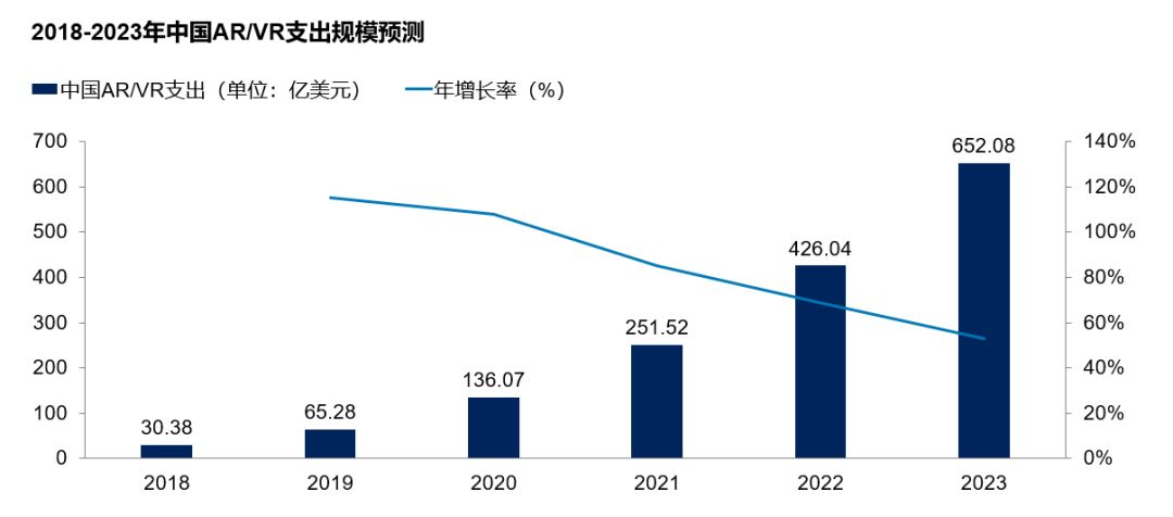 聚焦中国,根据IDC于2019年年中发布的《IDC全球增强与虚拟现实支出指南》,IDC预测:“至2023年,中国AR/VR市场支出规模将达到652.1亿美元,较2019年的预测(65.3亿美元)有显著增长。同时,在预测期内(2018-2023年),5年复合年增长率(CAGR)将达到84.6%,高于全球市场78.3%的增长率。”