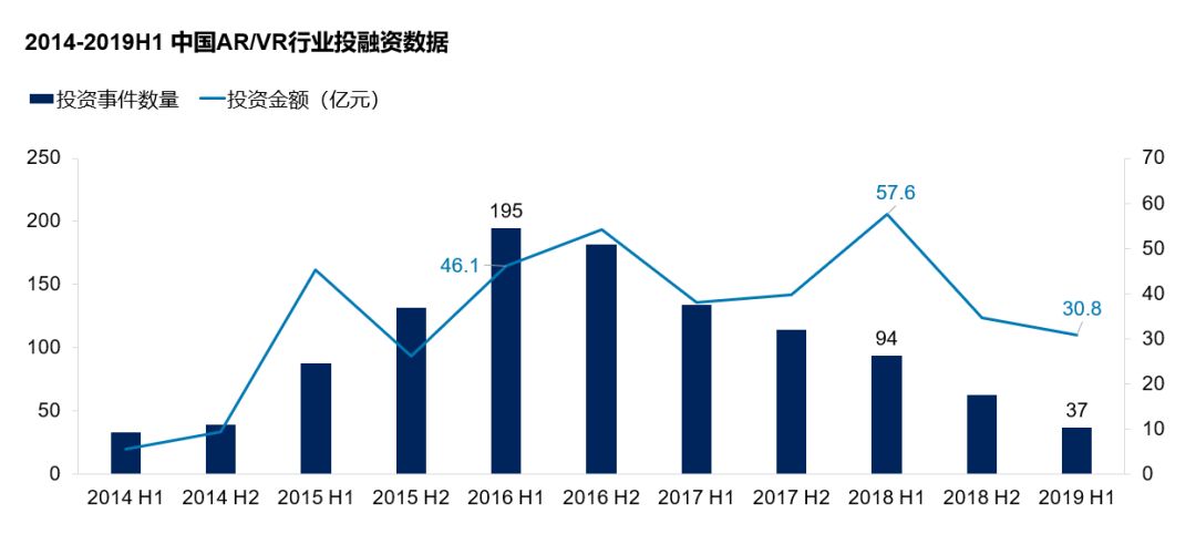 另一方面,从AR/VR行业投融资数据可看出,当前中国投资人对AR/VR行业的关注度下降,但是可以看到战略投资者正在积极的参与AR/VR行业的投资,不仅有阿里巴巴这类广泛投资的企业、还有为了完善其主营业务的网易科技、歌尔股份、金地集团、爱奇艺等企业。CVSource投中数据显示,从投资事件数量上看,2019 H1同比2018 H1下降61%,同比近年巅峰时期2016H1下降81%;然而从平均投资金额上看,2019 H1的平均投资金额同比2018 H1上升36%,同比2016 H1上升252%。