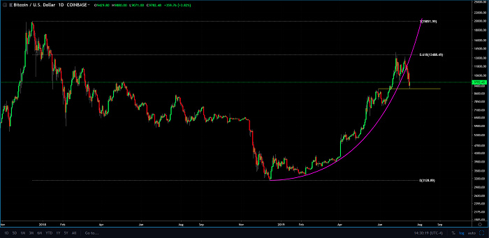 当前比特币12,000美元左右的价格远低于最初业内分析师们设定的10,700美元日高位,如果我们观察一下最近一周时间内的比特币表现,会发现其波动性是非常明显的,价格也一直在11,000美元下方不断调整。更重要的是,比特币自 3,200 美元开始攀升所形成的上升抛物线形态已经被打破,这意味着在不久的将来其价格有可能会进一步走低。