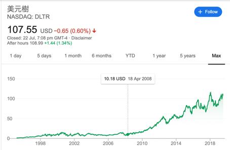 美元树诞生于 1993 年,店内的所有商品一律 1 美元。1995年,美元树在纳斯达克上市,市值 2.25 亿美元。2008 年金融危机后,美国实体零售业面临经济下行和亚马逊的双重夹击。零售巨头梅西、西尔斯百货一蹶不振,沃尔玛也在亚马逊的冲击下忙于应对。