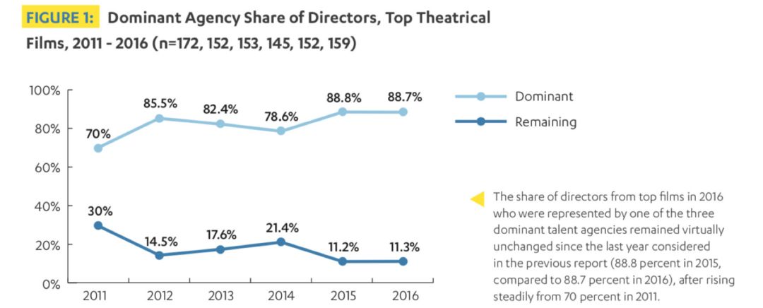 加州大学UCLA《好莱坞多样性》调查报告显示,向好莱坞大片厂输送人才的三大经纪公司几乎把持着北美头部院线电影。经纪公司的导演占比从2011年70%增长到2016年的88%,而且2015-2016年变化甚微,进入一个平稳的霸权时期。