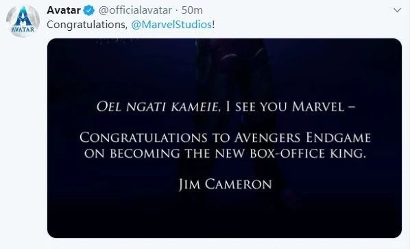 ▲《阿凡达》官推庆祝《复联4》夺全球影史票房榜首