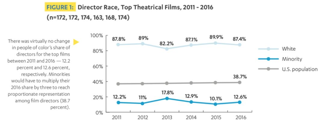 然而,三大经纪公司签约的有色人种导演仅有11.3%,在头部院线电影中,有色人种的导演占比常年不足20%。报告显示在450多名好莱坞高管中,96%是白人,87%是男性,平均年龄为65岁。担任导演职位的白人占比82%,男性占比 94%,而编剧是88%的白人和87%的男性。