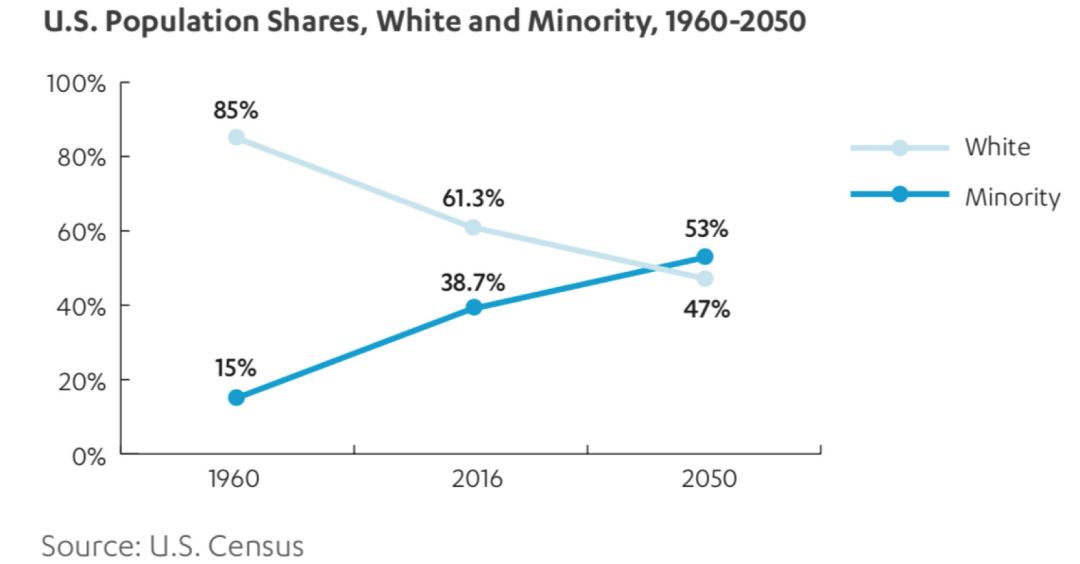 不难看出,正是这些年龄偏长的白人男性主导着好莱坞创作。这与北美社会人口发展实际情况背道而驰,2016年的人口普查中,白人占比已经下降至61.3%,有色人种已经增长至将近40%,名义上的“少数族裔”大有成为取代白人成为“多数族裔”的趋势。