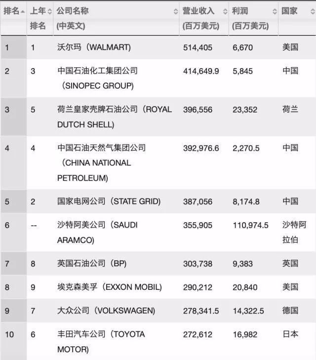 比如,前五名中的中国企业占据三个席位,分别为:中石化、中石油、国家电网。