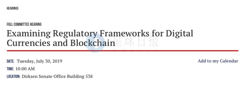 美国参议院将于月底举行“审查数字货币和区块链的监管框架 ”主题听证会