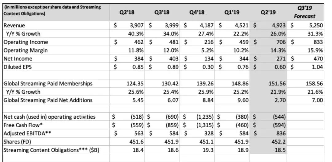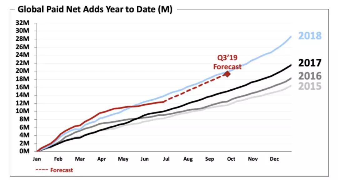 第三季度的前两周,由于大量影片的上映,奈飞的表现强劲。对于流媒体来说,优质内容的拉新能力是毋庸置疑的。从《延禧攻略》的千万级会员带动,到优酷最近的《长安十二时辰》热播撬动平台翻身,优质内容的影响力不容小觑。因此,奈飞也乐观估计,在第三季度优质内容的影响下,在第三季度美国的付费会员可以转跌为涨,并对第三季度做出700万会员增长的预测。