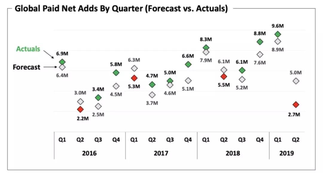 此次涨价举措带来了奈飞第一季度比较好看的财务数据,一季度全球净新增付费用户达到了960万,创下了奈飞近年来单季度的用户增长新高。但第一季度透支的用户增长,终将在第二季度还回来。对此,奈飞早有准备,在做增长预测的时候奈飞就将用户数打了个对折,给出第二季度500万的用户增长预测。