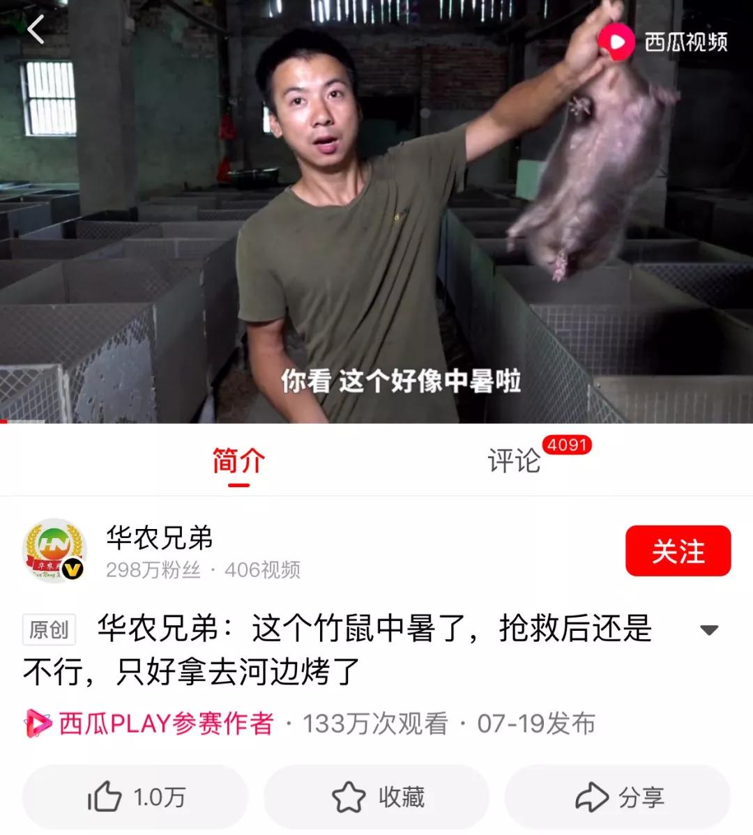 7月19日华农兄弟发布的视频《这个竹鼠中暑了,抢救后还是不行,只好拿去河边烤了》截止7月23日播放量已达133万次。