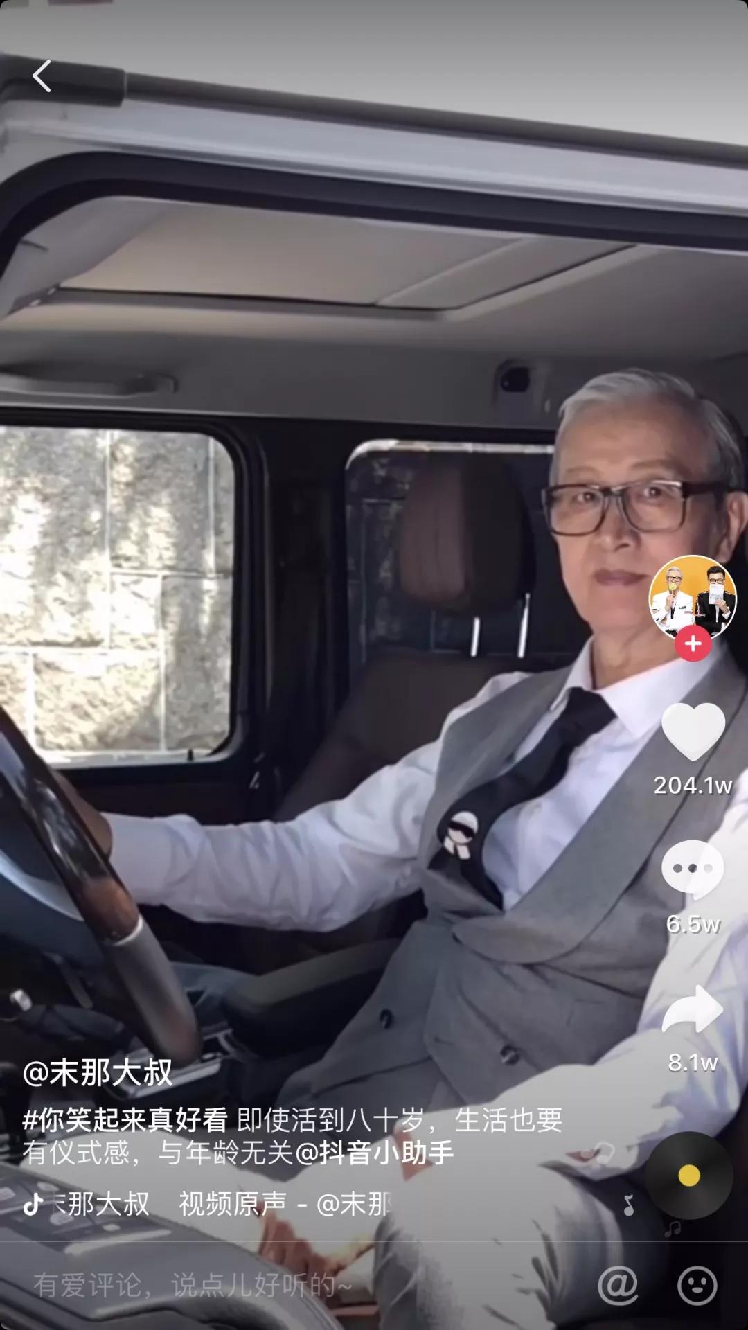 末那大叔抖音号上一段关于北海爷爷的视频点赞数为204.1万,评论高达6.5万条。