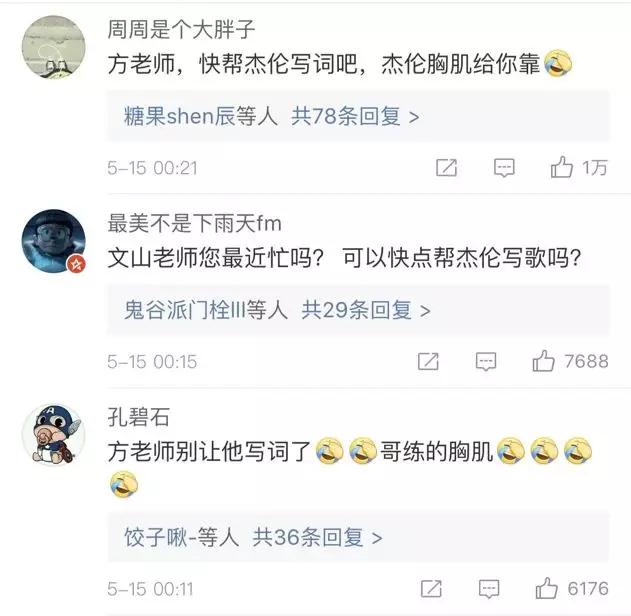 这跟以往方文山写歌风格相差十万八千里,粉丝在方文山微博炸开了锅:请您出面制止一下杰伦随意的歌词吧!但不足一小时,新歌评论超过10W。