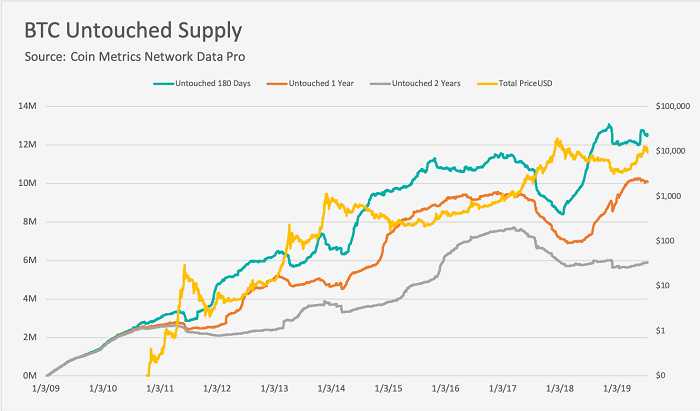 Tuur Demeester 更仔细地分析了 Coin Metrics 的图表数据,发现与更长时间框架相比,180 天和一年时间内的“未移动比特币”数量明显更多,而且同时期内对应的比特币价格也在上涨。