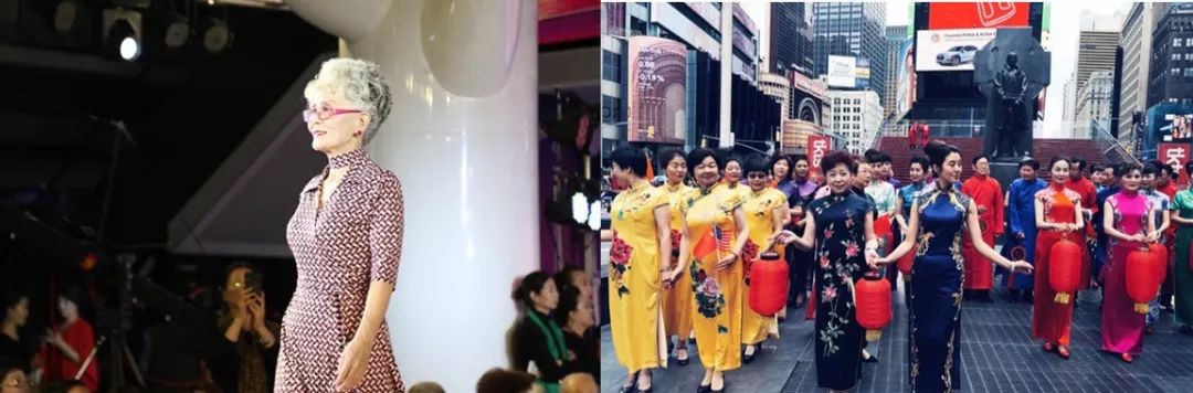 (左)2018年北京中老年时装周;(右)退休俱乐部在纽约时代广场上演的老年旗袍秀