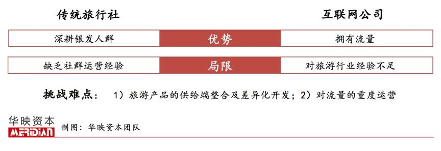 目前市场上有两类公司,一是线下旅行社,原本业务的萎缩倒逼公司转型,深耕银发人群,但普遍团队缺乏社群运营经验;二是拥有流量端的互联网公司,因对传统旅游行业的不专业,所有线下的坑还要再踩一次,影响了原本积累的重度粉丝。这对创业公司是一个挑战,挑战的难点在于旅游产品的供给端整合及差异化开发,以及对流量的重度运营。