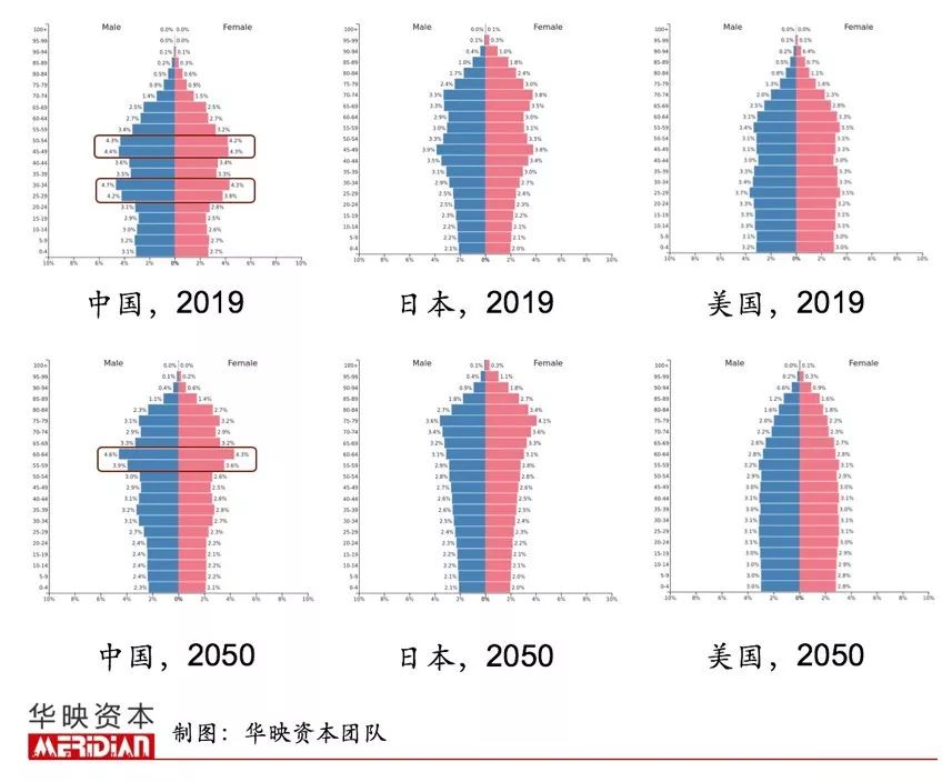 放眼世界,人口老龄化在发达国家和部分发展中国家是一个普遍现实。选取中美日三国作为典型,从2019年到2050年,我们能较为明显地看出60岁以上人群占比的扩大。