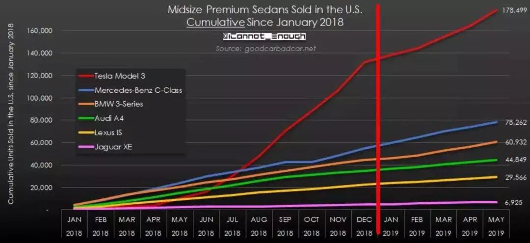 从2018年1月起美国豪华中型轿车累计销量统计图可以一窥端倪。在2018年12月,Model 3的累计销量增长曲线出现了一个拐点,而奔驰C级、宝马3系、奥迪A4、雷克萨斯IS和捷豹XE没有出现明显的拐点。