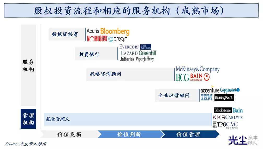 海外成熟市场之所以“成熟”,是因为其存在大量的第三方服务机构为GP提供服务,而往往一线GP因为财力雄厚且有丰富的企业采购经验,更加擅长使用这些“工具”,所以使机构内部的人力得到解放,让团队可以更加专注的集中于具体案子的细节信息上。